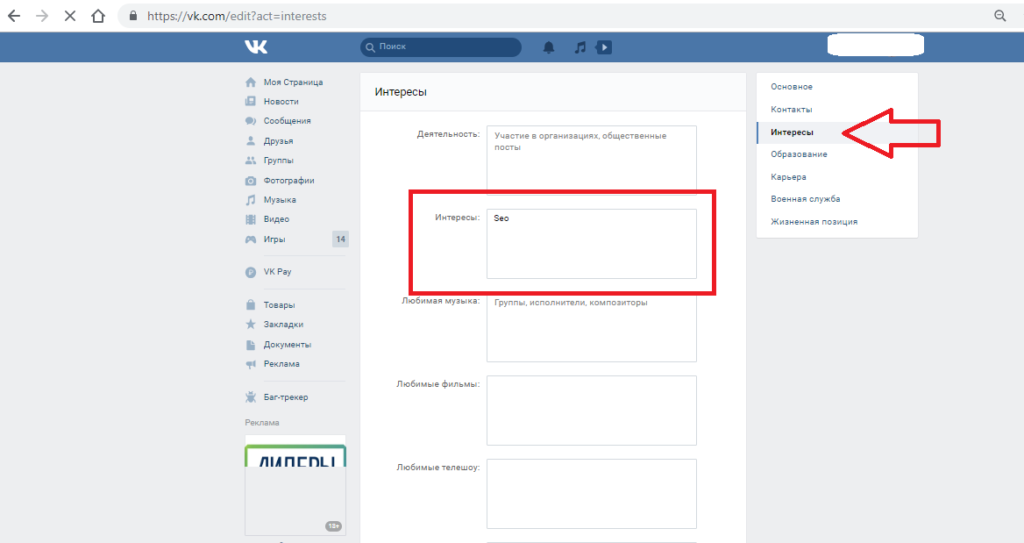 Для начала давайте разберемся где находится данный раздел настроек в социальной сети. Чтобы изменить информацию в интересах вам необходимо нажать на свою аватарку в правом верхнем углу сайта нажать на значок редактировать и перейти в 3 пункт интересы где вам представляется огромный список для заполнения о себе.