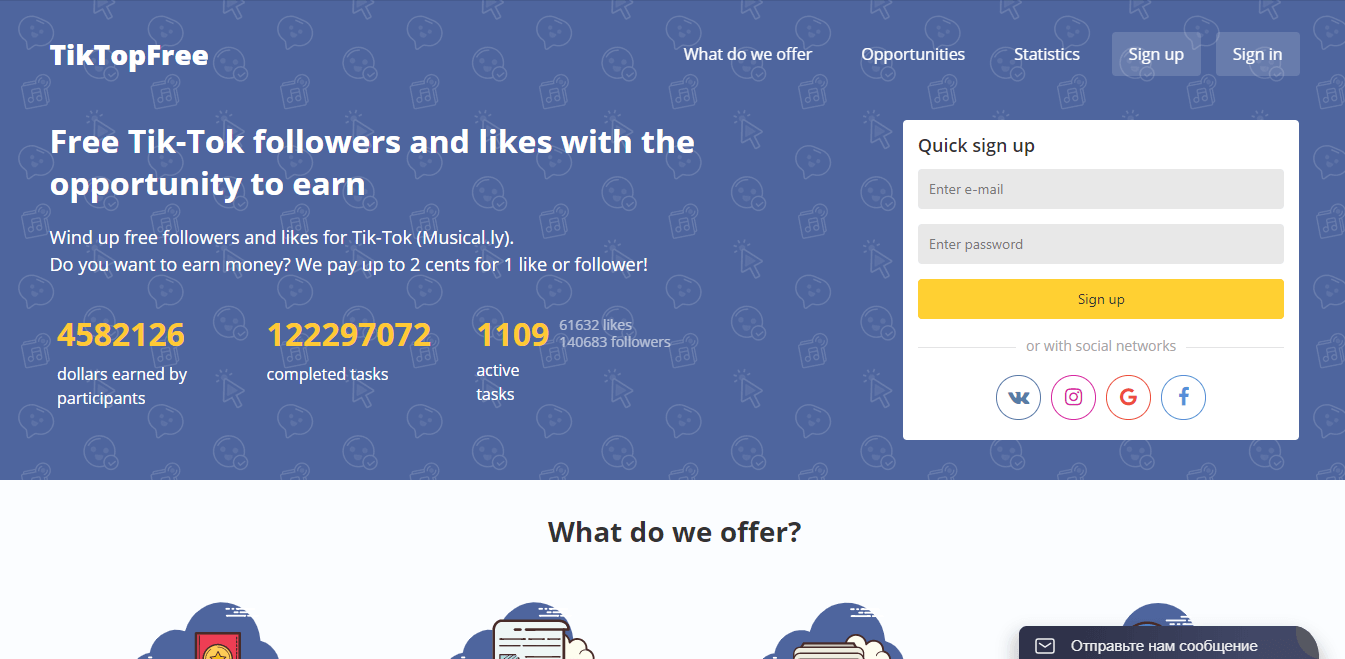 Такая же биржа, обещающая живых людей. Можно заказывать все реакции для аккаунта в Тик Ток. Фолловеров можно также купить со скидкой 50 %.