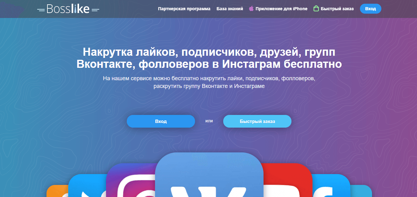 Bosslike — популярный сайт для накрутки. Чтобы сделать заказ, не обязательно даже регистрироваться. Предлагается бесплатная раскрутка за выполнение заданий других пользователей (для этого регистрация потребуется). За каждый выполненный тикет начисляются баллы, которые можно потратить на услуги сервиса.
