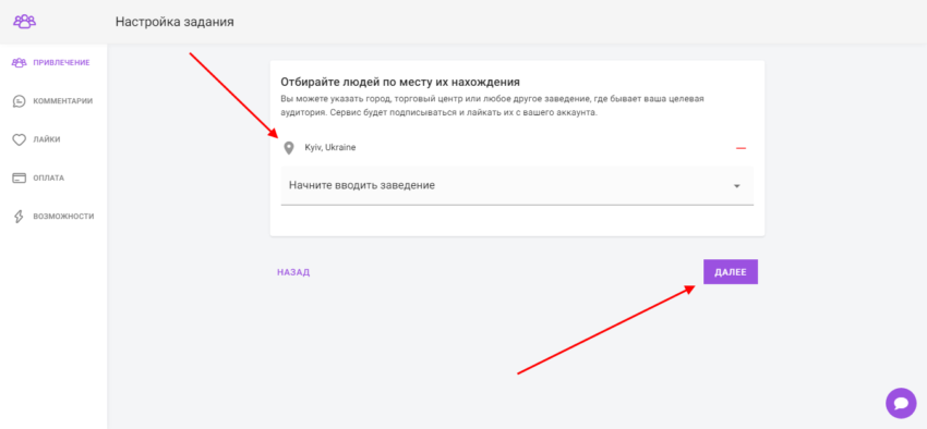 - Вводим местоположение людей, на которых будет происходить подписка, затем жмем «Далее».
