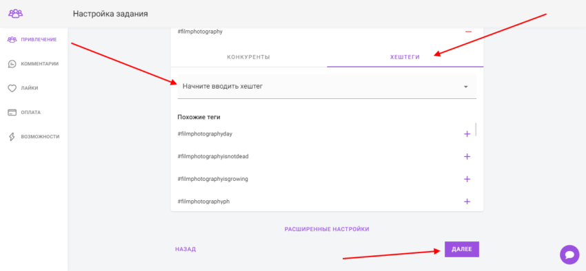 - Добавляем конкурентов или хэштеги, по которым будут набираться подписки.