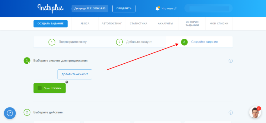 - Подтверждаем почту и возвращаемся на сервис. Там кликаем по кнопке «Создать задание» и в нижней части экрана добавляем свой аккаунт от инстаграма. Заполняем данные и нажимаем на кнопку «Добавить аккаунт».