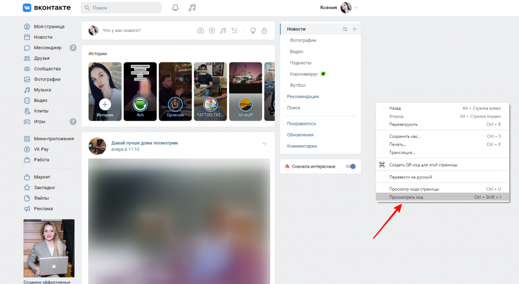 Также чужую сторис можно скачать с компьютера. Для этого зайдите в новости. Далее кликните правой кнопкой мыши и нажмите «Посмотреть код страницы».