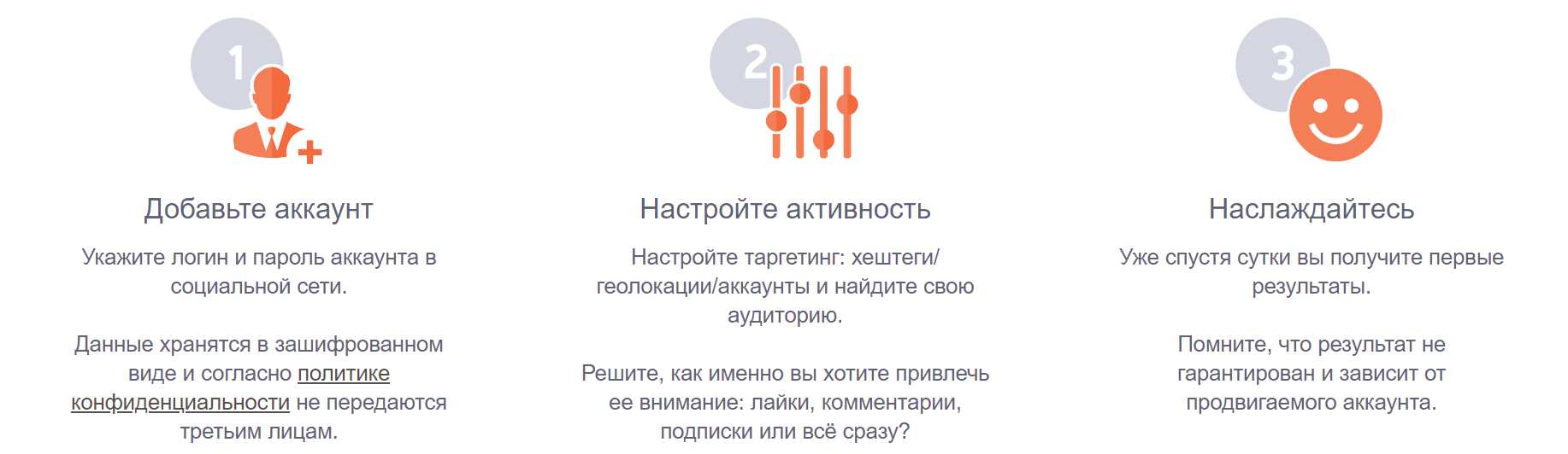 После обработки внесенной вами информации, сервис начнет свою работу по собственным алгоритмам. Привлечение новых подписчиков будет производиться круглосуточно. От вас лишь требуется периодически заходить в программу и редактировать настройки.